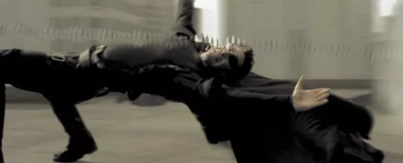 Gaeta's team trained acircular array of 122 still cameras on Keanu Reeves, then triggered them in sequence. Because cameras located on one side of Reeves were visible to those on the other, Gaeta needed a way of generating photorealistic sets so the camera could be removed from frame.